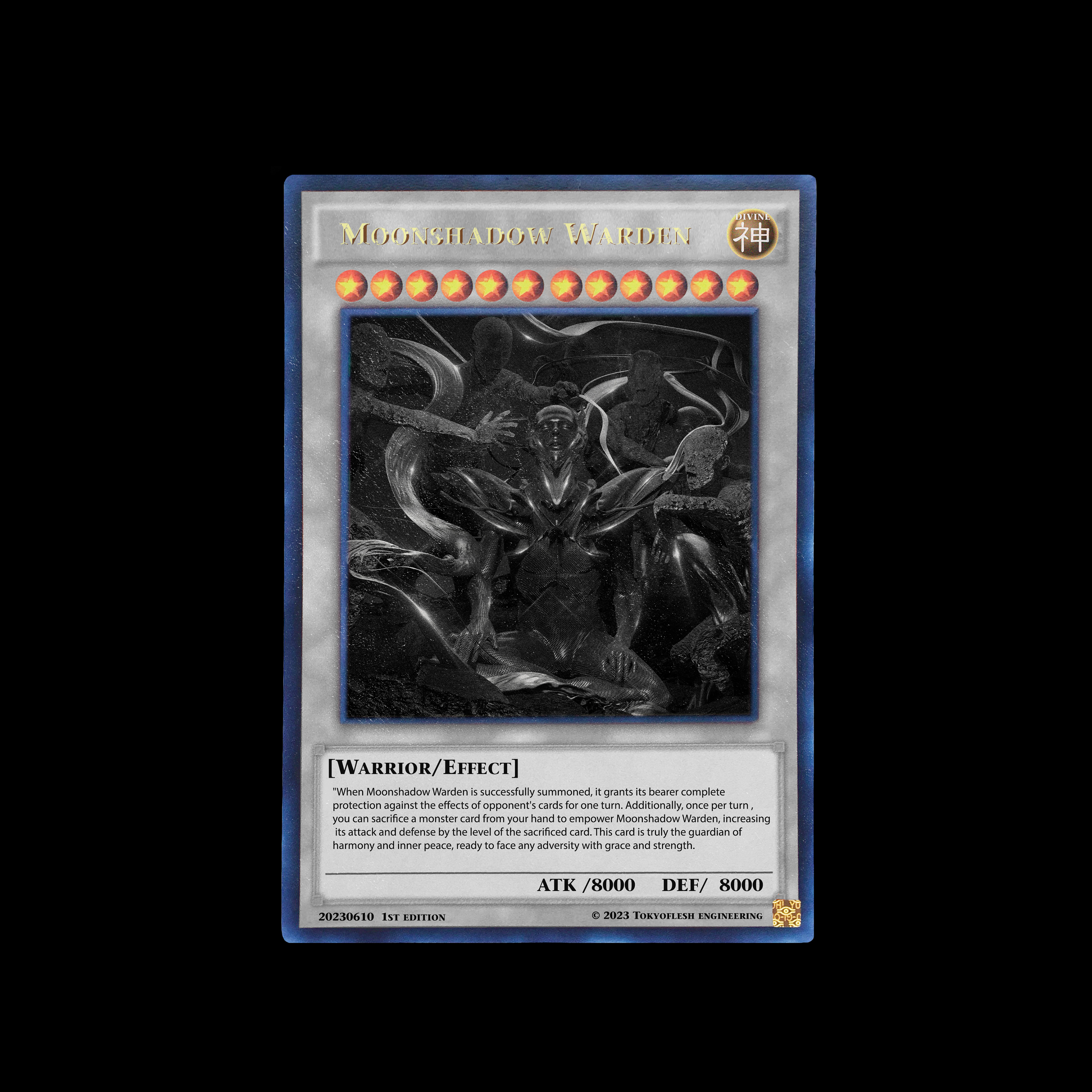 When Moonshadow Warden is successfully summoned, it grants its bearer complete protection against the effects of opponent's cards for one turn. Additionally, once per turn , you can sacrifice a monster card from your hand to empower Moonshadow Warden, increasing its attack and defense by the level of the sacrificed card.